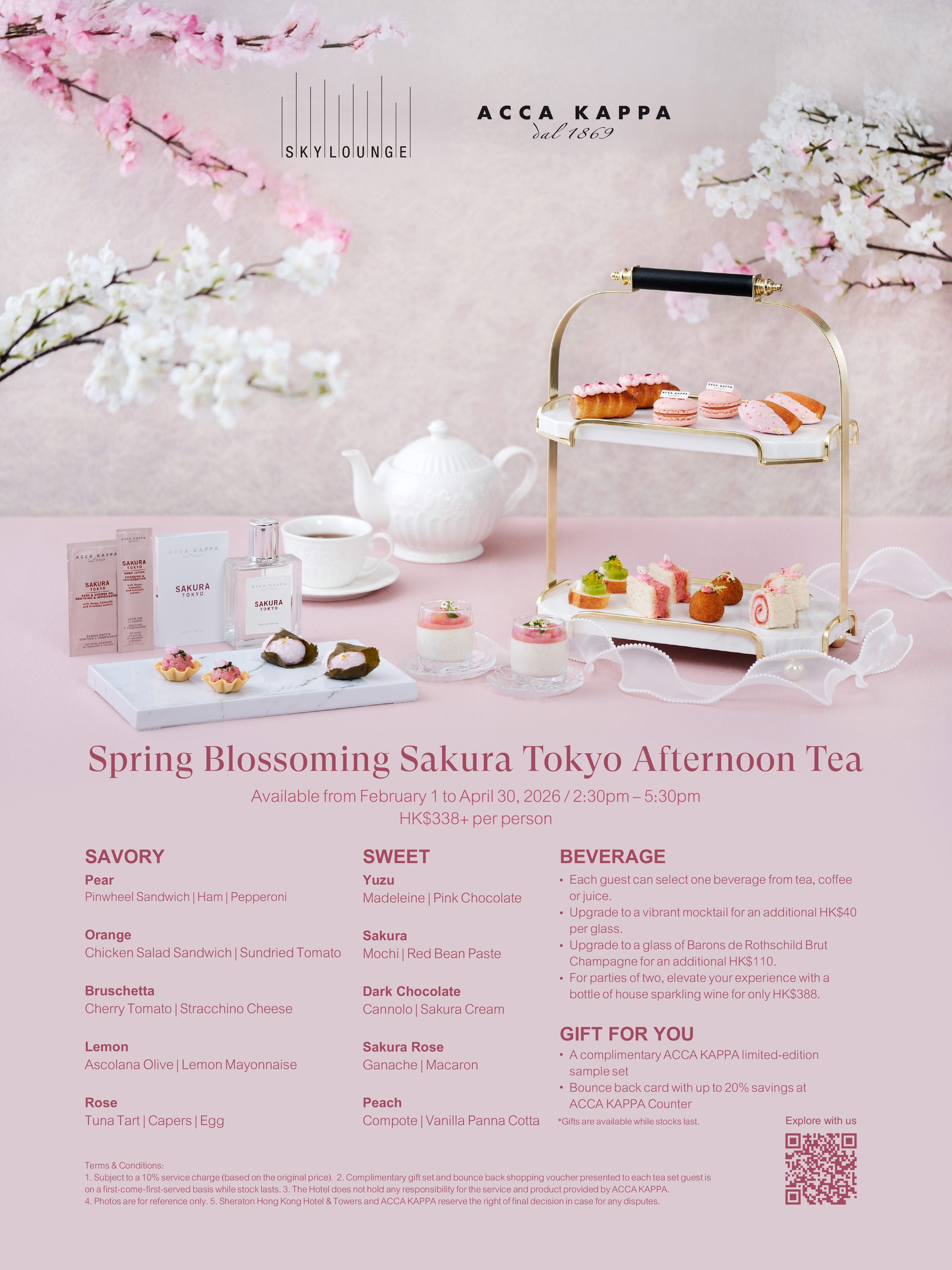 With every purchase of the “Spring Blossoming Sakura Tokyo Afternoon Tea” through the Sheraton Hong Kong eShop, each guest will receive an extra ACCA KAPPA Exclusive Shopping Privilege Voucher. Simply visit ACCA KAPPA counter and explore the exquisite “Sakura Tokyo” collection, guest will receive a complimentary Sakura Tokyo Body Lotion or a Sakura Tokyo Shower Gel (50ml).