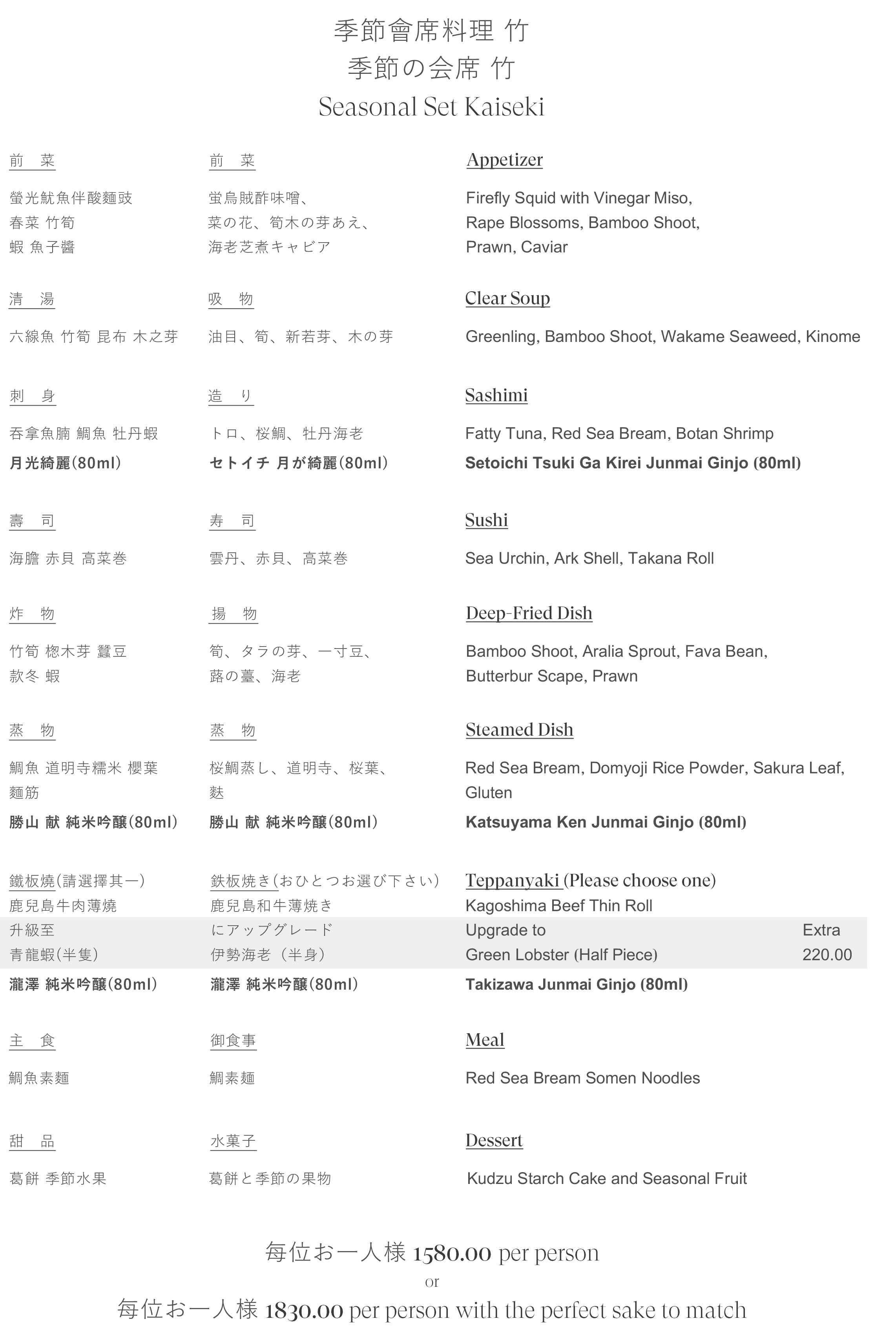 Seasonal Set Kaiseki Dinner Menu $1,580- per person, Exclusive 20% savings on e-Shop $1,264- per person;