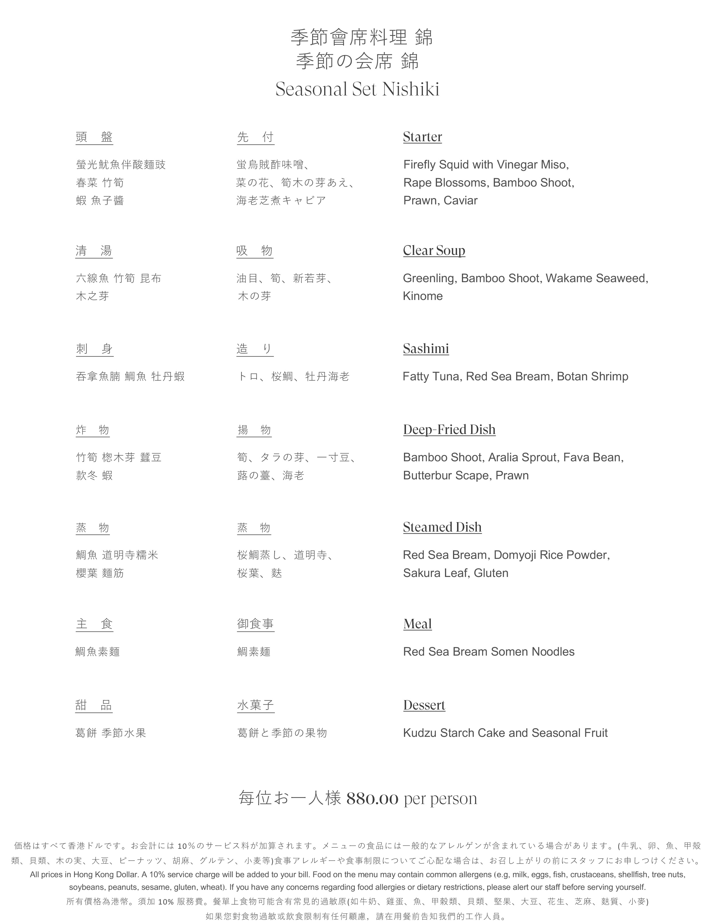 Seasonal Set Nishiki Lunch Menu $880- per person, Exclusive 20% savings on e-Shop $704- per person;