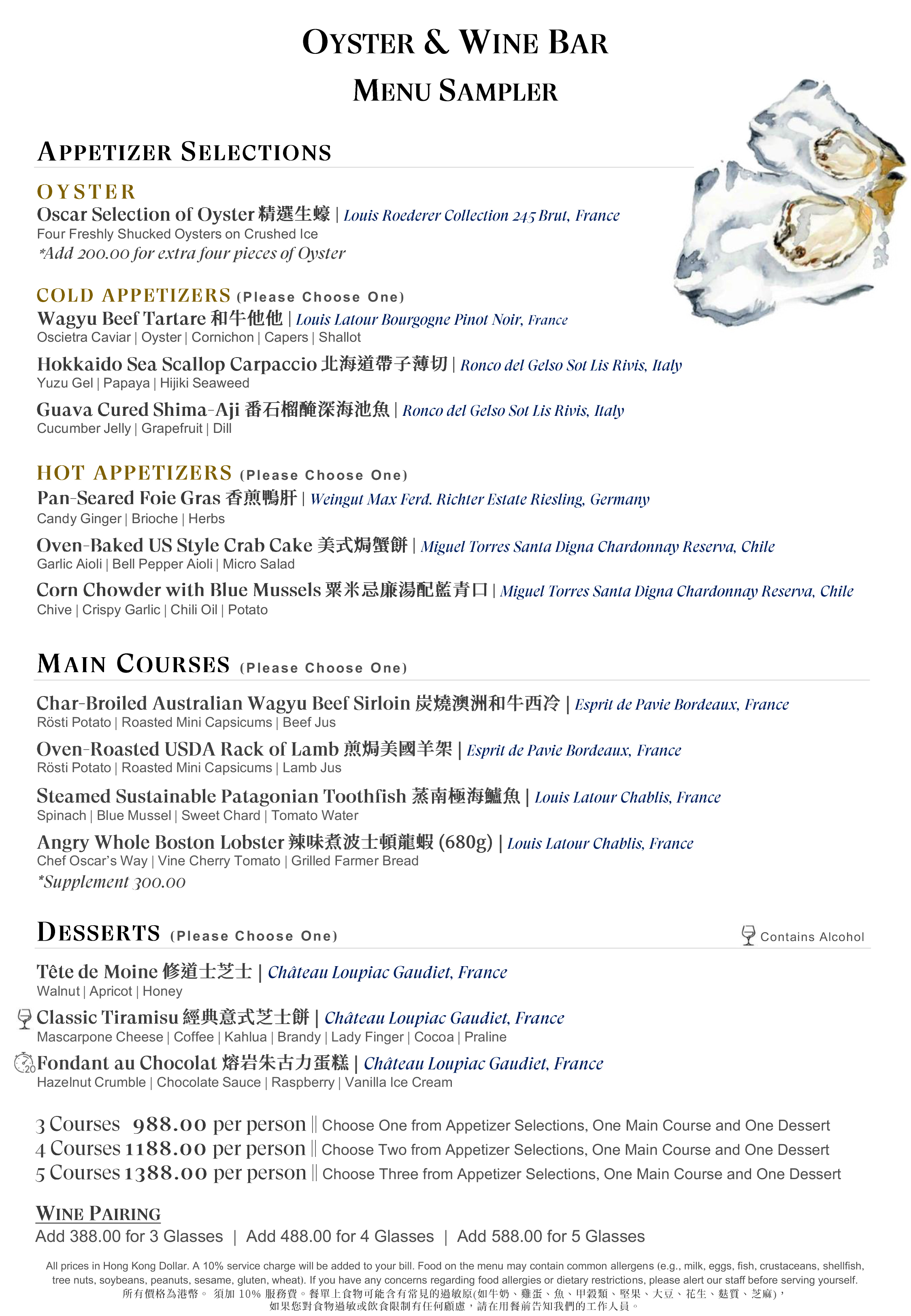 從蠔酒吧的招牌新鮮生蠔、廣受歡迎的開胃菜、吸睛的主菜到精緻的甜點,以每道精緻菜式滿足味蕾,搭配一杯精選香檳,讓您感受到美食帶來的獨特體驗,享受徹底的感官享受!
